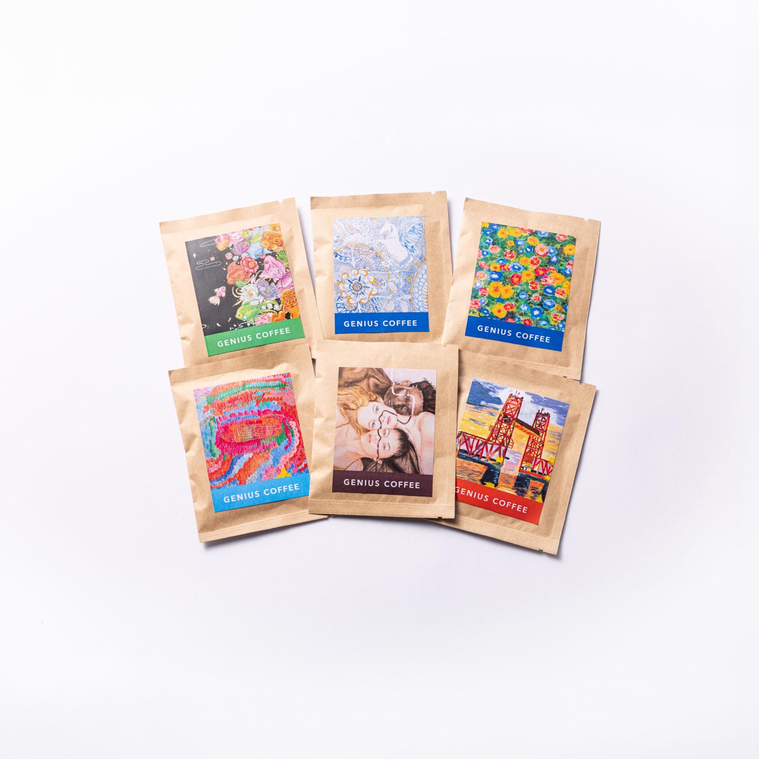 そこで活動するアーティストたちが、手仕事でハンドピックから焙煎までを手掛けるスペシャルティコーヒー。9カ国の厳選されたコーヒー豆はクオリティが高いことでも知られ、ドリップバッグはラベルが40種類以上のアートを選べて、ジャケ買いを誘うGENIUSの人気商品です。
